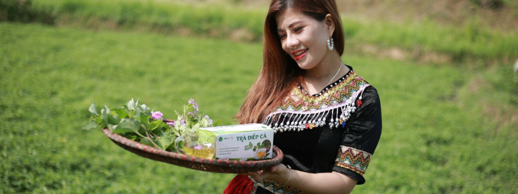 Chị Vy Thị Lụa, tác giả ý tưởng “Trà Diếp cá Lụa Vy” trả lời câu hỏi của Hội đồng giám khảo
